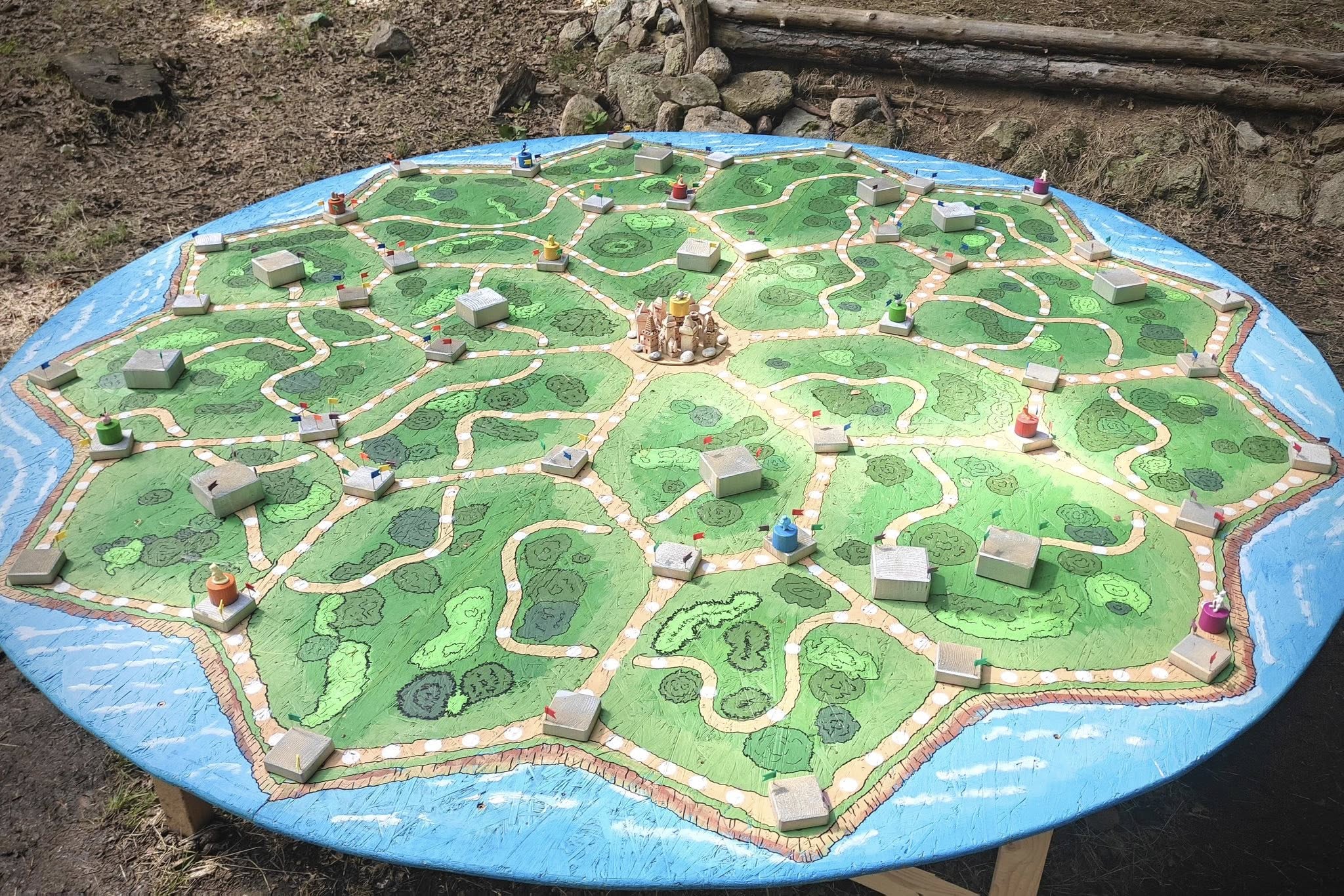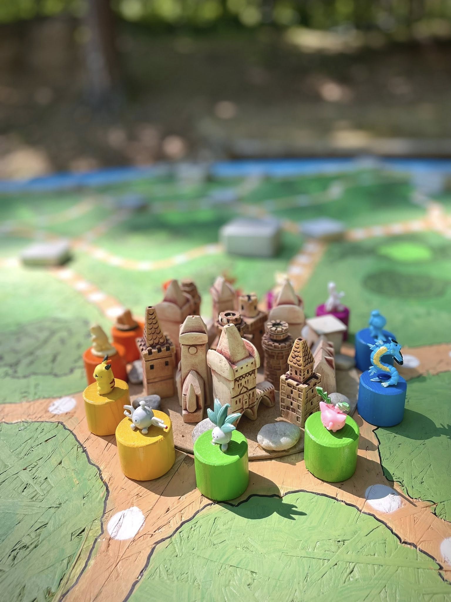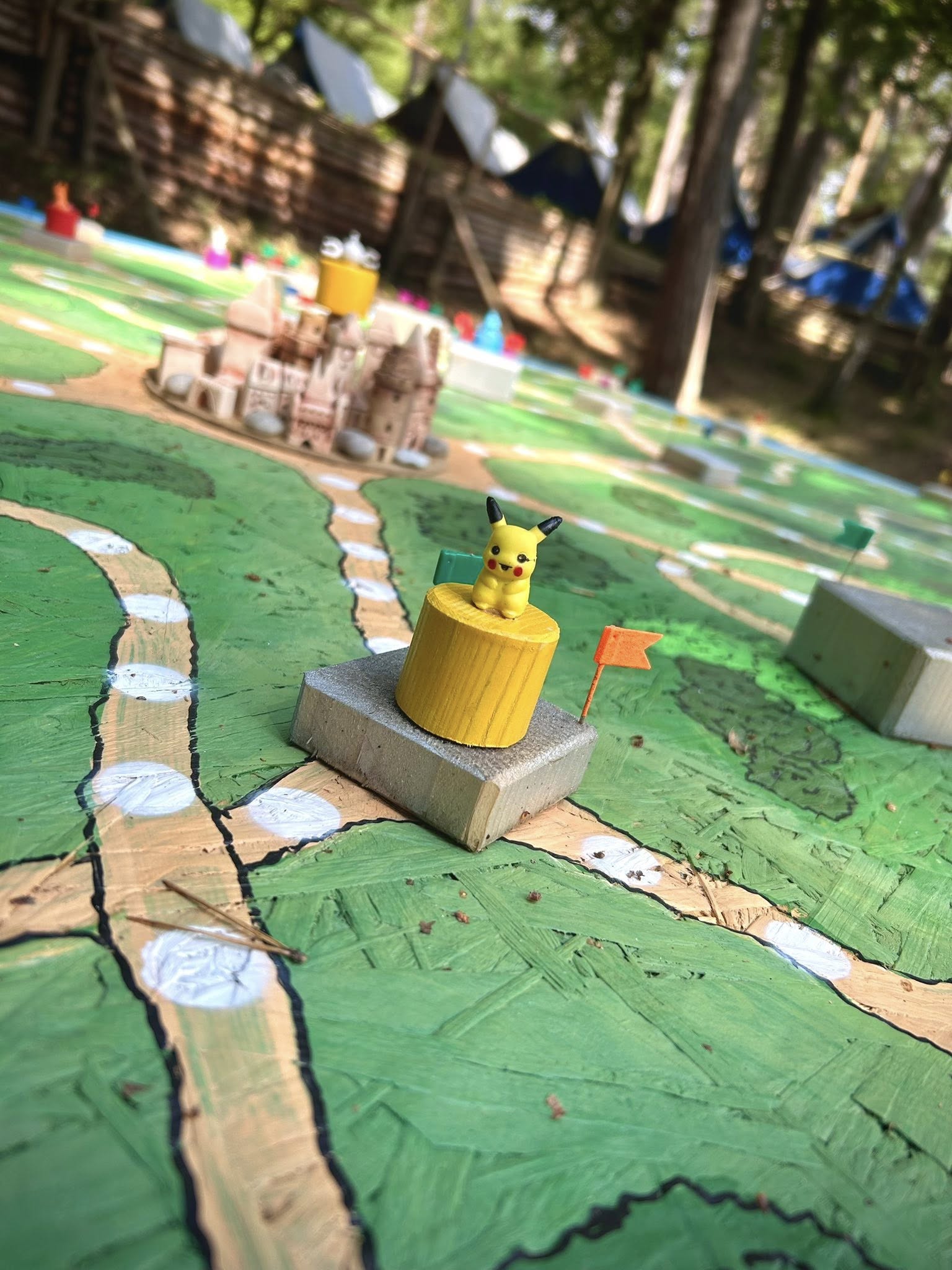 Celým táborem byla propletena velká celotáborová hra. Naše trenérské týmy vyrážely z Oblázkového městečka na dobrodružnou cestu po mapě, kde sbíraly odznaky z nejrůznějších arén. Čekaly je soutěže, souboje a karetní duely s Rakeťáky, kteří se samozřejmě snažili všem zkomplikovat cestu k vítězství.